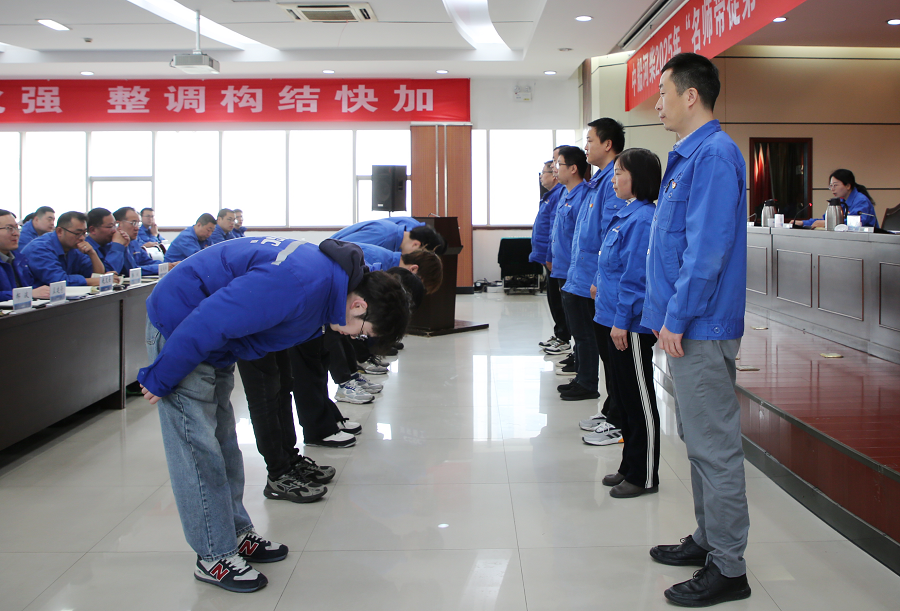 會(huì)議對(duì) 2024年度“名師帶徒弟,導(dǎo)師帶學(xué)生”活動(dòng)進(jìn)行了總結(jié),表彰了2024年度“優(yōu)秀師傅/導(dǎo)師”,宣讀了2025年度“名師帶徒弟,導(dǎo)師帶學(xué)生”結(jié)對(duì)名單。技能層面和技術(shù)層面的師徒代表進(jìn)行了現(xiàn)場(chǎng)簽約,并舉行了傳統(tǒng)拜師儀式。大件制造廠張選偉、總裝廠鄭曉臣分別代表 2025 年度新簽約師傅、徒弟發(fā)言。
